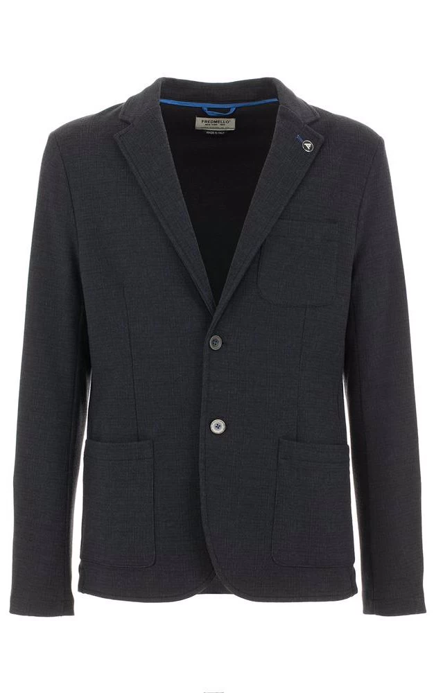 Fred Mello jacket with two button closure, two front pockets one breast pocket, classic collar with Fred Mello logo pin.
