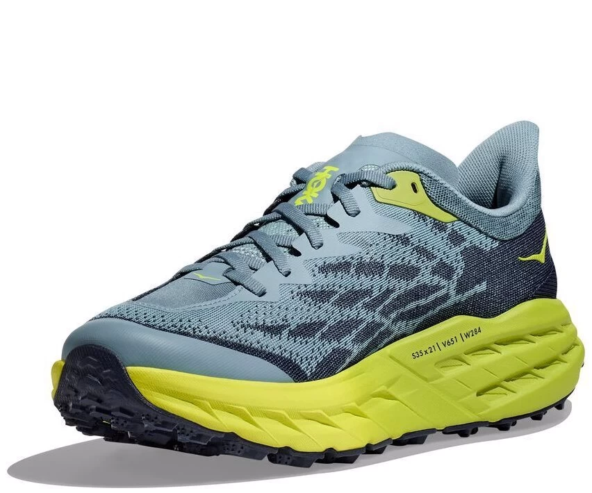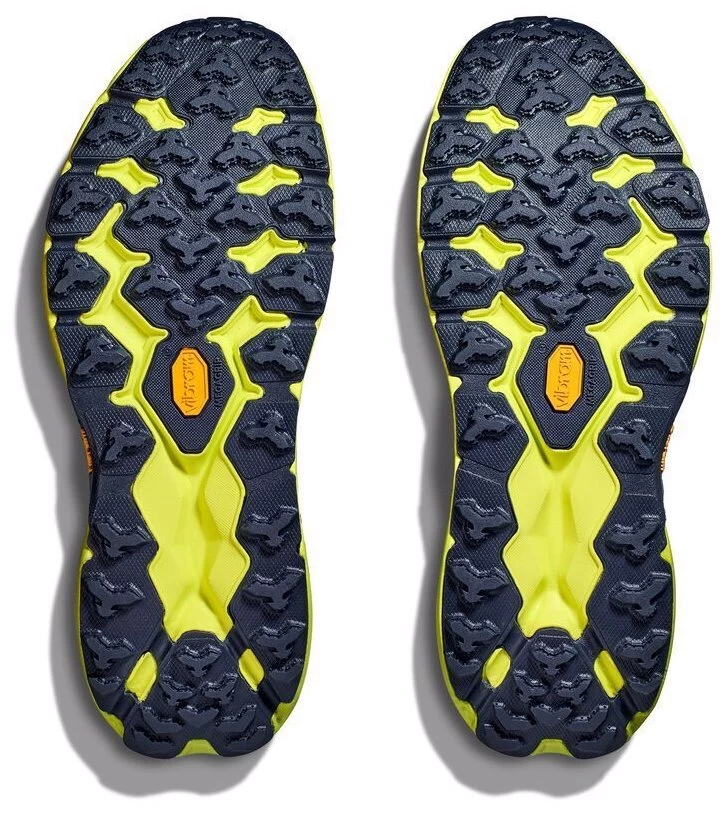 A workhorse designed for technical trails, the Hoka Speedgoat returns with less weight and more traction than ever before. A new shoe from outsole to laces, this trail beast is updated with Vibram® Megagrip with Traction Lug for enhanced grip on loose soil. Retaining the same stack height and rocker profile, the Speedgoat 5 employs a lighter midsole compound and heartier, double layer jacquard mesh to inspire confidence on any terrain.