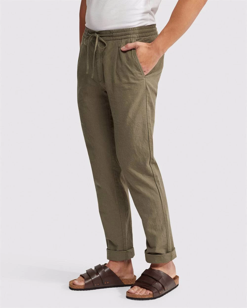 The Fraser Linen Cotton Pullon Pants are a fresh change for your spring and summer look. These smart casual pants are crafted from a luxurious linen cotton blend and cut in a slim fit with a straight leg. They feature an elastic waistband with drawstring, side and back pockets, and cuffed hem. Team them with the matching Alister Linen Cotton Overshirt and sandals for head-to-toe style. Our model is wearing size (AU) 86 trousers, and usually takes a size 86. He is 185cm (6’1.75”) tall with a 96.52cm (38”) chest and 81cm (32”) waist.