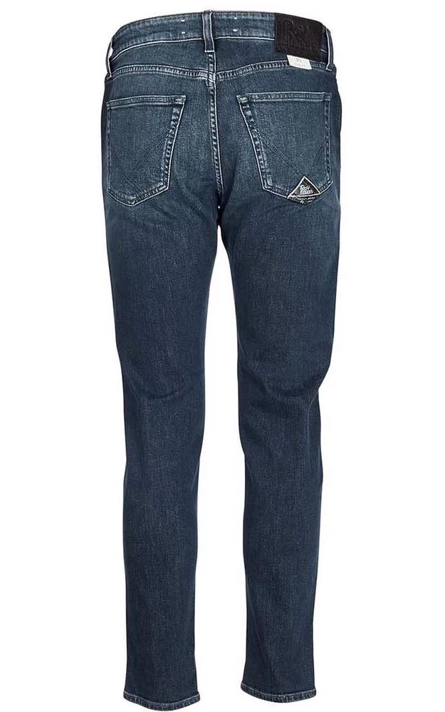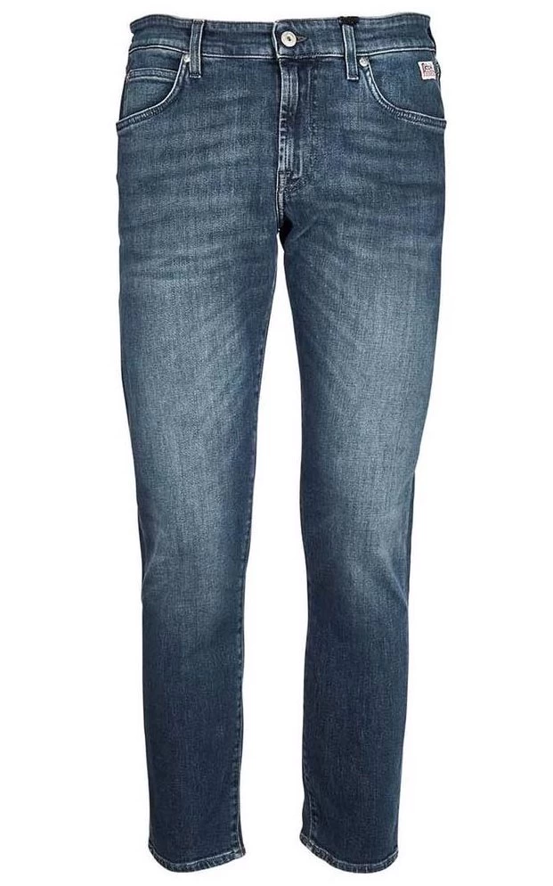 Roy Roger#8217;s jeans in stretch cotton, Foxrun model, five pockets with zip button closure. Belt loops leather patch on the back.